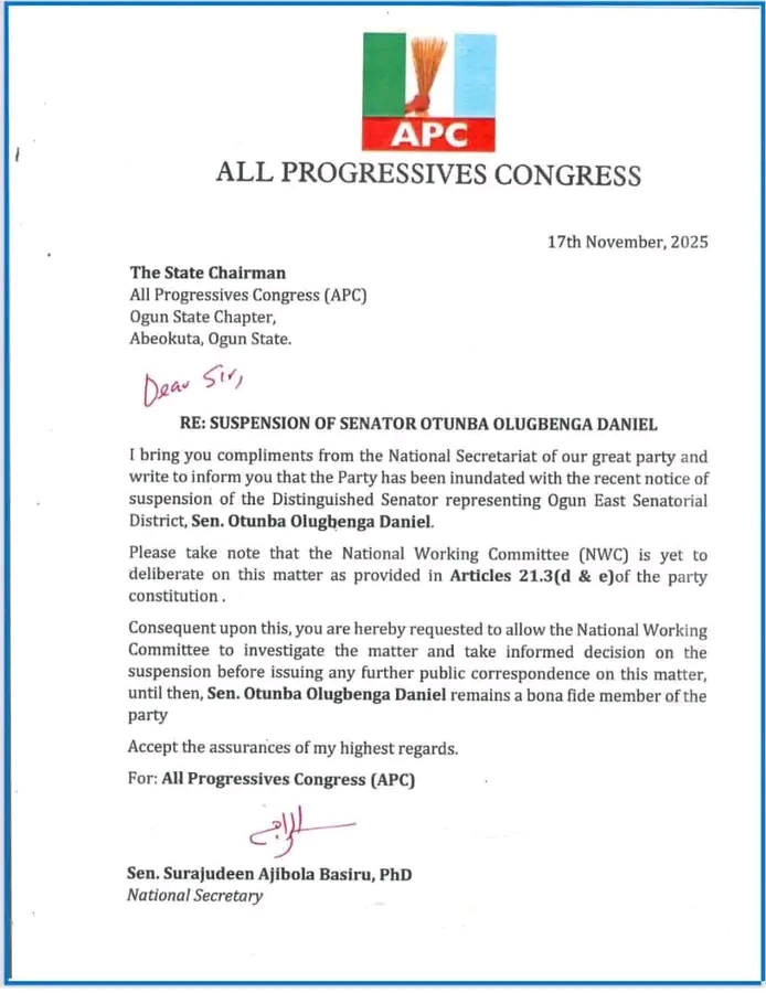 In a letter addressed to the Ogun State Chairman and dated November 17, 2025, the National Secretary of the party, Sen Surajudeen Ajibola Basiru, PhD, said the national body had been flooded with reports about the alleged suspension of the senator who represents Ogun East Senatorial District.