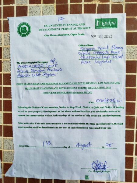 The move came just three days after the Ogun State Planning and Development Permit Authority issued contravention and quit notices over alleged breaches of the state’s Urban and Regional Planning and Development Law No. 61 of 2022.