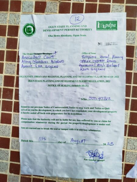 Officials from the Sagamu Zonal Office stormed the premises mid-morning, pasting fresh “Sealing” and “Demolition” notices on gates and walls.