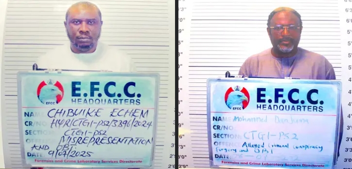 The two defendants were arraigned on Tuesday by the Economic and Financial Crimes Commission on a 55 count charge bordering on advance fee fraud, forgery, and the alleged award of fictitious contracts. Another suspect, identified as Aminu Alhaji, was said to be at large.