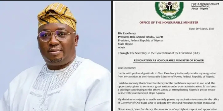 The Minister of Power, Adebayo Adelabu, has resigned from the Federal Executive Council, formally declaring his intention to contest the 2027 governorship election in Oyo State.
