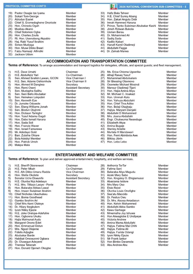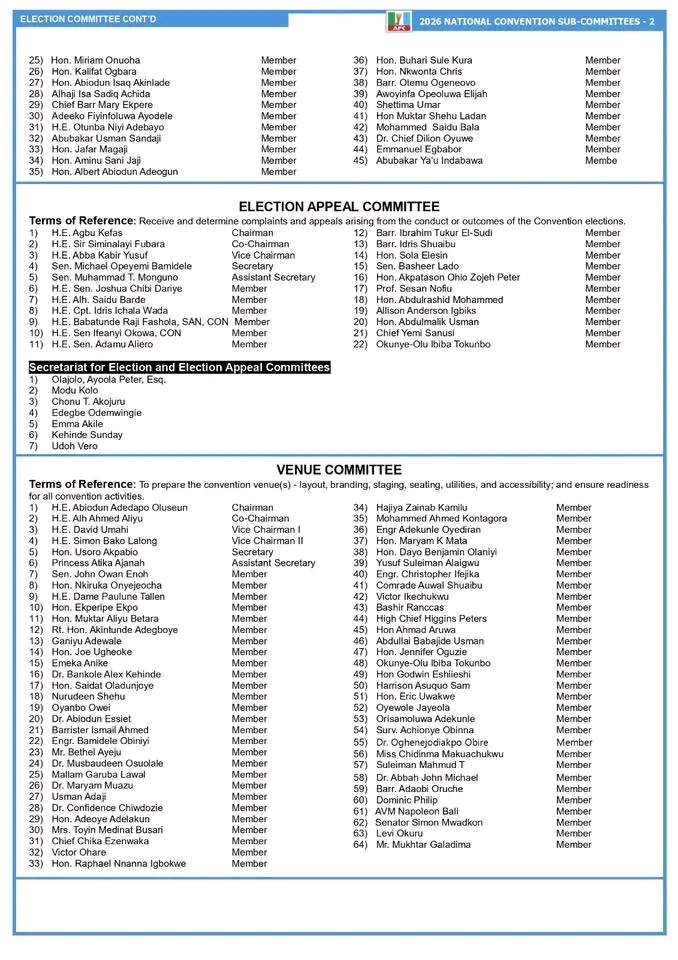Other prominent members of the committee include Ogun State Governor, Dapo Abiodun; former Ogun State Governor, Olusegun Osoba; former Interim National Chairman of the APC, Bisi Akande; former Speaker of the House of Representatives, Yakubu Dogara; and former Deputy Senate President, Ovie Omo-Agege, among other senior party leaders.