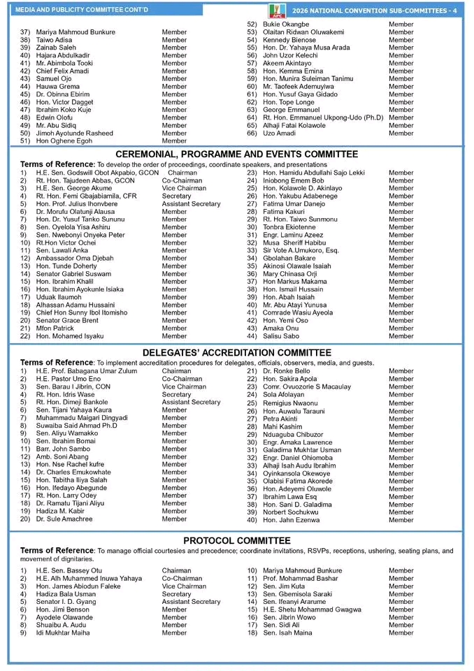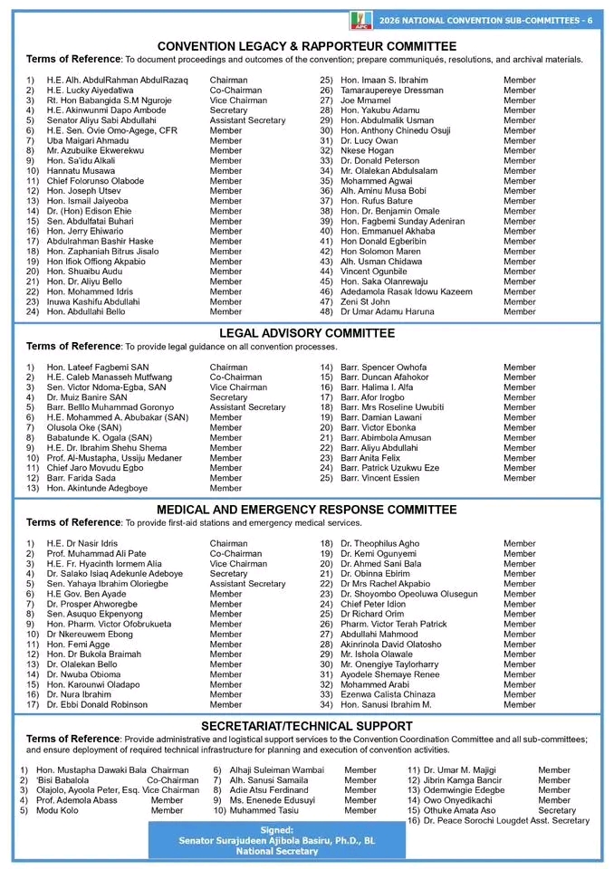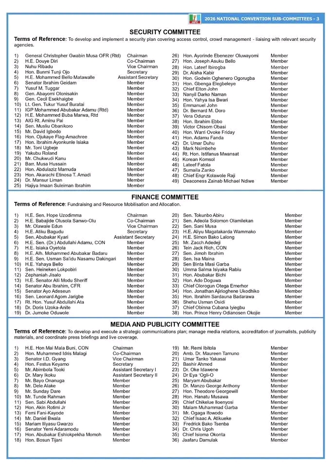 The committee is chaired by former Governor of Katsina State, Aminu Masari, and has been mandated to organise a successful, transparent and inclusive national convention that will further strengthen internal cohesion within the party and strategically position it for the next electoral cycle.