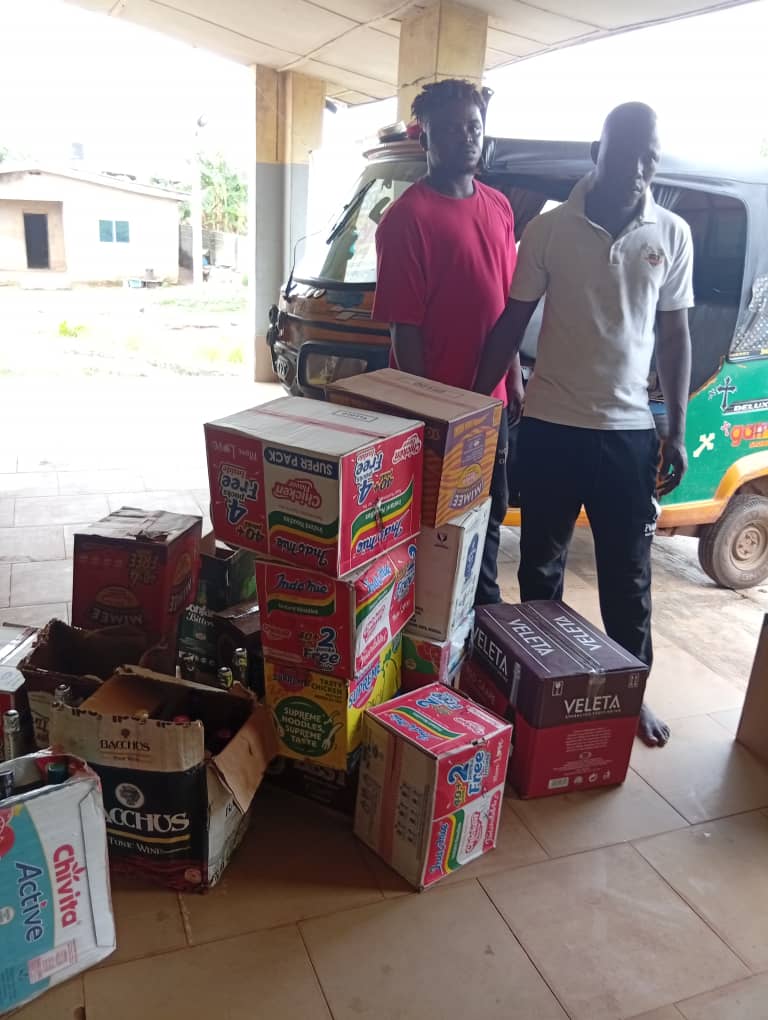 Items recovered from the suspects include cartons of wine, noodles, groundnut oil and a yellow tricycle allegedly used for the operation.